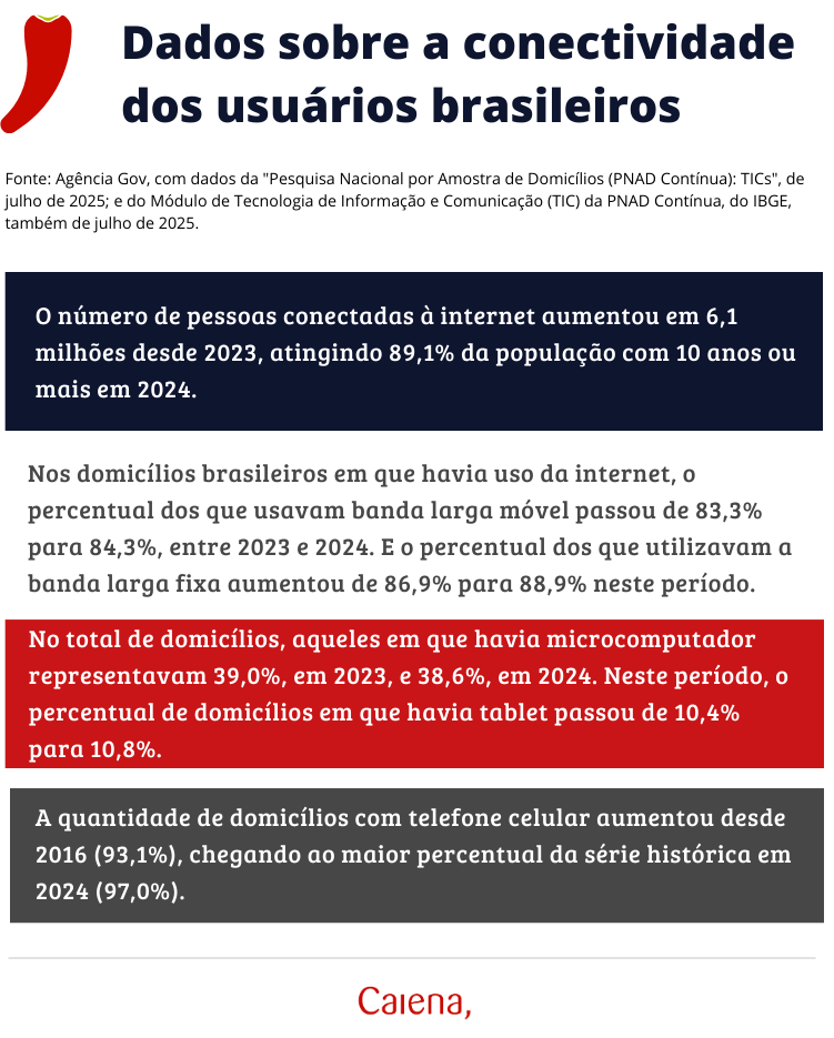 A população brasileira está ON, seja pelo smartphone, notebook, computador, tablet… O país já acumula 502 milhões de dispositivos digitais, o que significaria 2,4 dispositivos por pessoa, segundo pesquisa da FGV (dados de 6 de junho de 2025). O total de aparelhos equivale ao dobro de habitantes, hoje estimado em 213,4 milhões de pessoas pelo IBGE.